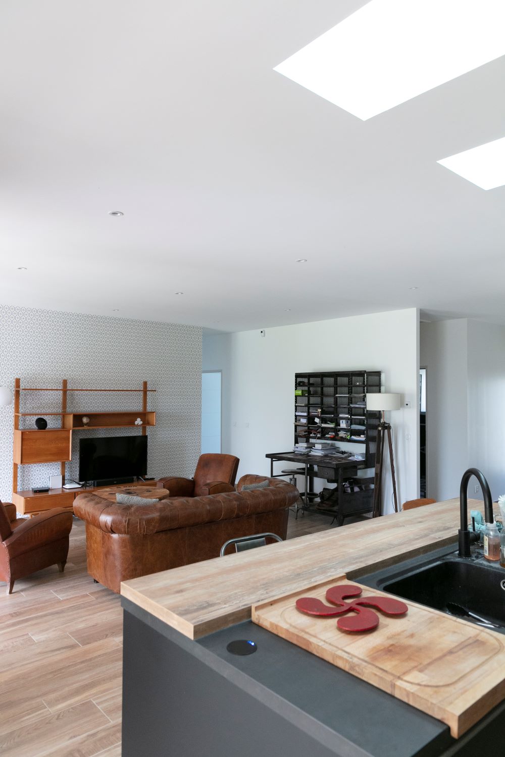 Nichée au milieu des arbres, cette maison neuve fait la part belle à la luminosité avec pas moins de 7 baies vitrées qui lui font profiter au maximum de sa double exposition. Deux Vélux viennent s’ajouter pour apporter une lumière différente sur l’espace de vie. Un espace de vie de plus de 45m² qui est l’élément central de cette maison moderne si particulière.