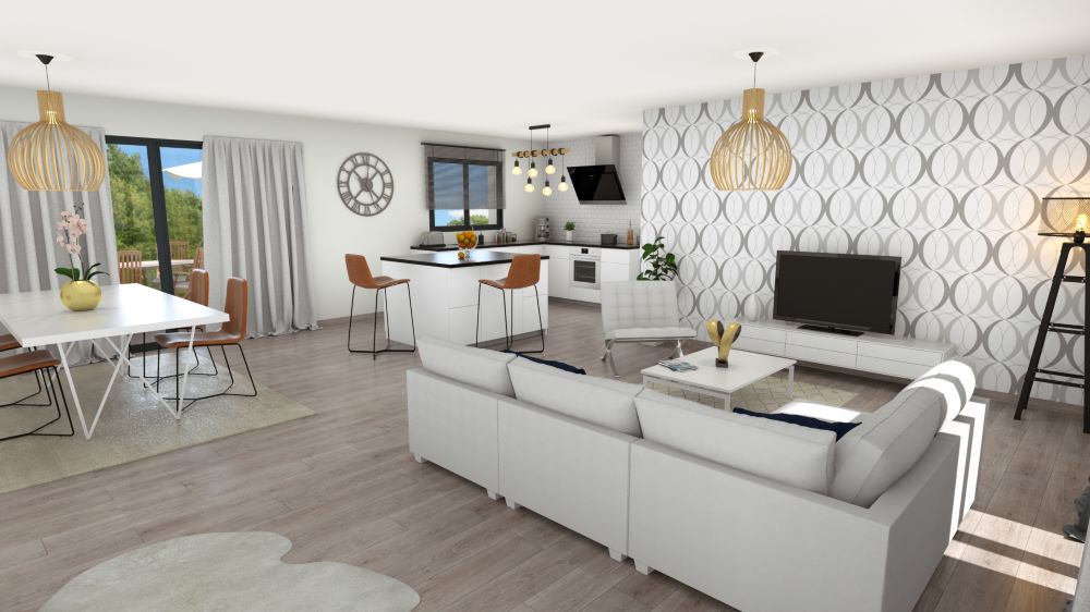 Le porche s’ouvre sur une spacieuse pièce de vie de plus de 50m², vraie espace de vie qui saura apporter convivialité au sein de la maison. Sa double exposition vous permettra de profiter d’une luminosité maximale et d’une configuration adaptable selon vos envies. La cuisine ouverte est attenante à un cellier indépendant qui mène au garage. Le garage, en léger décroché, ajoute sa pointe de modernité.